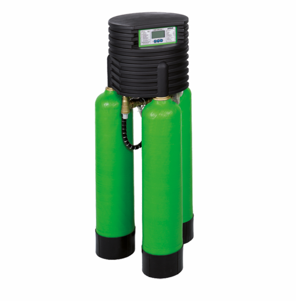 Die Enthärtungsanlagen Delta-p sind mit einem Zentralsteuerventil für die drei Austauscher ausgestattet und werden mengenabhängig gesteuert.
