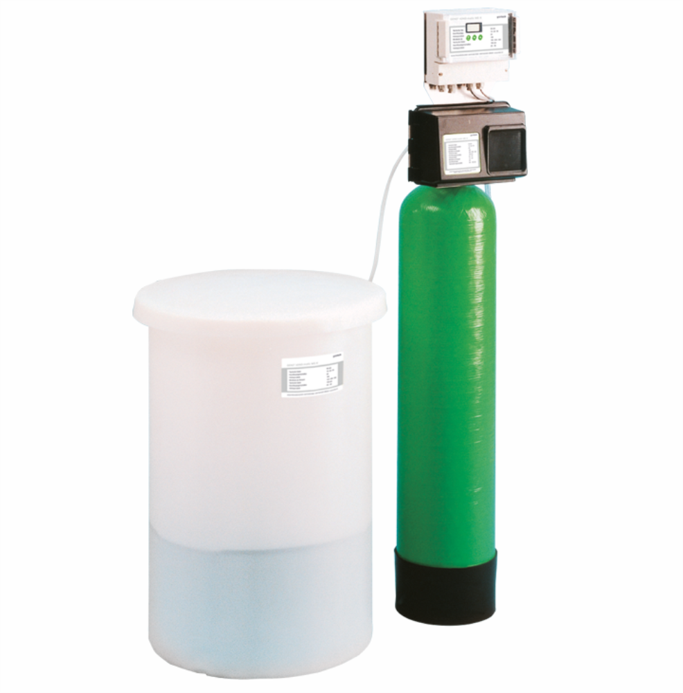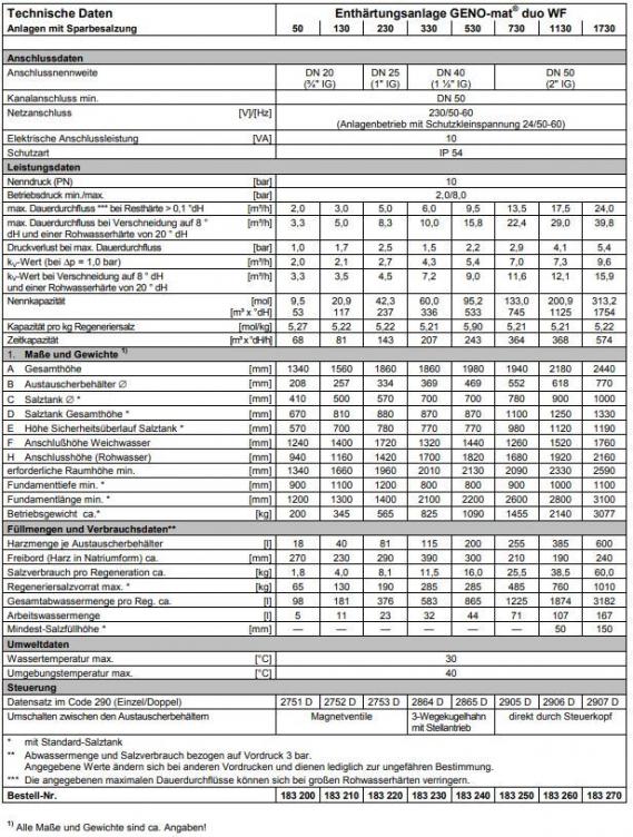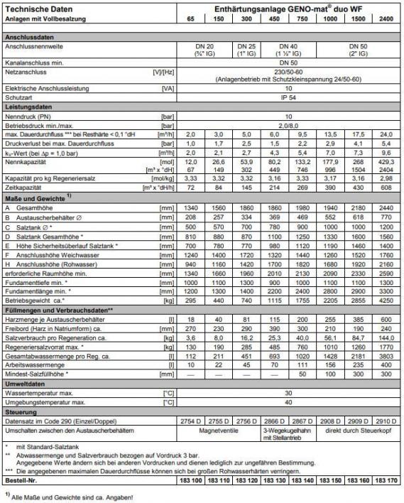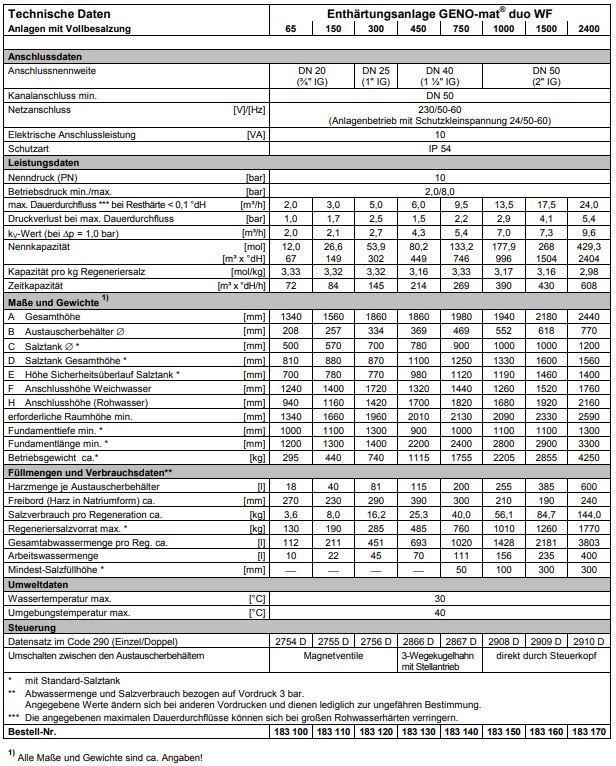 Die Enthärtungsanlage GENO-mat® duo WF ist eine Doppelanlage zur kontinuierlichen Versorgung mit Weichwasser. Sie ist mit einer mengenabhängigen Steuerung ausgestattet. Jeder Austauscherbehälter verfügt über einen eigenen Steuerkopf. Bei Ausfall eines Austauschers lässt sich der andere als Einzelanlage betreiben. Die Regeneration wird ausgelöst, wenn die vorgegebene Wassermenge in einem Austauscherbehälter enthärtet wurde.
