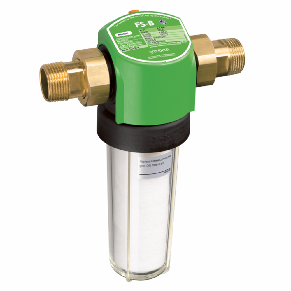 Der GENO®-Feinfilter Typ FS-B schützt die Hauswasserinstallation und filtriert Trinkwasser (DIN EN 806-2). Der strömungstechnisch optimierte Feinfilter ist aus hochfestem, technischem Kunststoff. Integriert sind Gewindeanschlüsse aus Messing für den waagrechten Einbau (für senkrechten Einbau siehe Filterbaureihe BOXER®), der Feinfilter besitzt Wasserzählerverschraubungen. Wartungsfreundlich erinnert die integrierte 12-teilige Datumsanzeige an das rechtzeitige Auswechseln des Filtereinsatzes (DIN EN 806-5). Die transparente Filterglocke ist von Hand schraubbar und beständig gegen Haushaltsreiniger. Der Feinfilter beinhaltet in Erstausstattung eine Filterkerze (Polyethylen) mit 80 µm (0,08 mm) Filterfeinheit. Lieferbar sind auch Filtereinsätze mit 5, 20 und 50 µm.