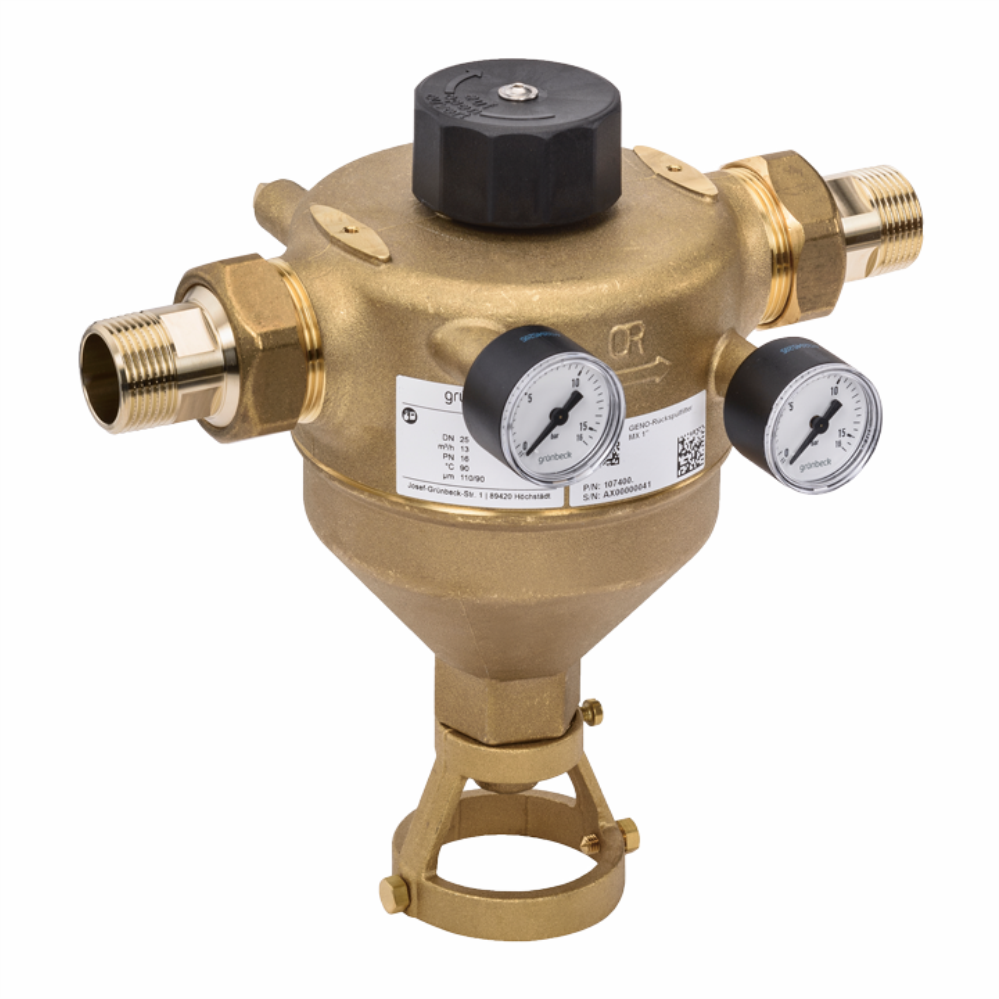 Der handbediente GENO®-Rückspülfilter MX mit Verschraubungen (bis Nennweite DN 50) filtriert Trinkwasser nach DIN EN 806-2 in Haushalten, Gewerbe und Industrie. Alle mediumberührten Teile des Filters sind aus Messing oder hochwertigem, technischem Kunststoff. Das modulare Filterelement enthält ein Filtergewebe aus Edelstahl mit bis zu 100 μm Filterfeinheit. Die Abstreifbürsten erlauben eine mechanische Zusatzreinigung des Filtereinsatzes während der Rückspülung. Die verschleißarme Rückspülmechanik stellt auch während des Rückspülvorgangs filtriertes Trinkwasser zur Verfügung. Über den Spülwasseranschluss kann HT Rohr DN 50 eingeklemmt werden. Der GENO®-Rückspülfilter MX ist mit zwei Manometern ausgestattet. Der Serienfiltereinsatz besitzt 100 µm Feinheit, auch Filterelemente mit 50, 200 und 500 µm sind lieferbar.