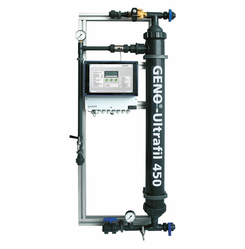 Die Ultrafiltrationsanlage GENO®-Ultrafil dient zur Reduzierung von mikrobiologischen Belastungen (Keime, Bakterien,Viren, Parasiten) und zur Verminderung von Trübstoffen im Trinkwasser, speziell beim Einsatz in Eigenwasserversorgungsanlagen. Der Membranfilter der Ultrafiltrationsanlage GENO®-Ultrafil besteht aus einer Vielzahl von Kapillarmembranen mit einer Trenngrenze von kleiner 0,01 μm, deren Enden in einem Druckrohr fest eingegossen sind. Dadurch kann eine sichere Trennung der belasteten Rohwasserseite von der Reinwasserseite sichergestellt werden. Das durch einen Feinfilter (z.B. BOXER® RD) vorfiltrierte Rohwasser wird von unten auf die Rohwasserseite des Membranfilters geleitet und durchströmt dabei das Membranelement von innen nach außen. Mikroorganismen und Partikel werden hierbei auf der Membranoberfläche zurückgehalten.